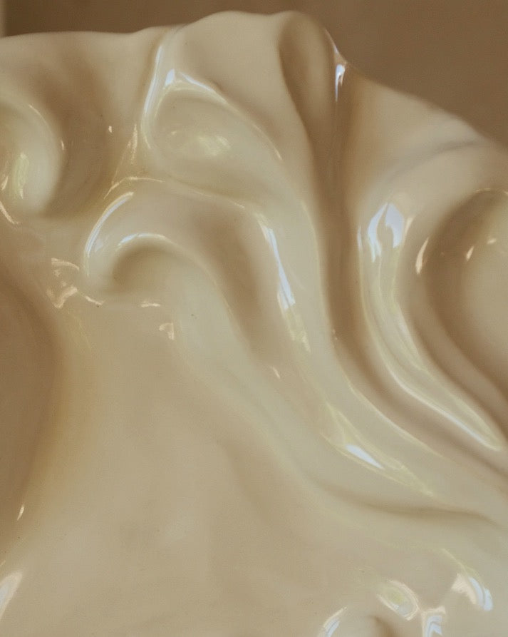 This plate is hand-sculpted in stoneware clay and features intricate floral reliefs. Glazed in antique white finish. Each piece is individually made and one of a kind.